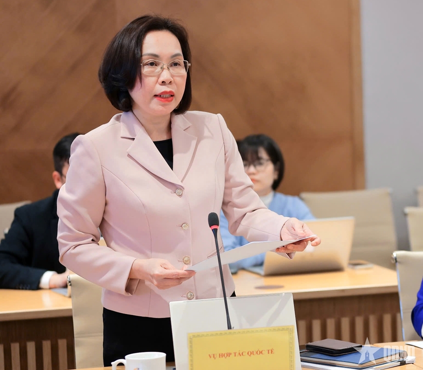 | Bà Lê Thị Việt Lâm, Phó vụ trưởng Vụ Hợp tác quốc tế chia sẻ tại họp báo. |