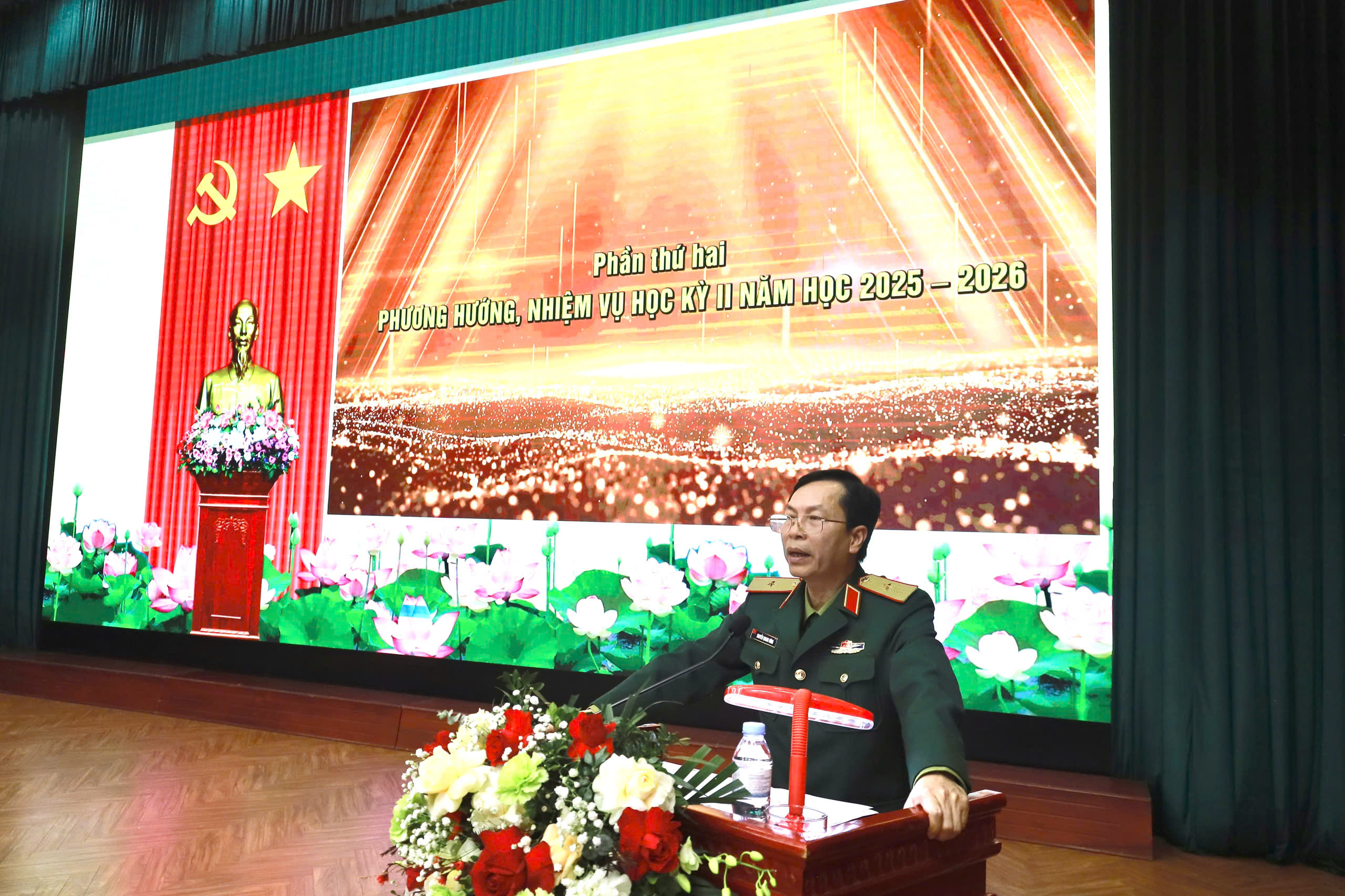 Về nhiệm vụ học kỳ II, năm học 2025 - 2026, đồng chí Giám đốc Học viện yêu cầu toàn Học viện tiếp tục quán triệt sâu sắc các nghị quyết, chỉ thị của trên về công tác giáo dục, đào tạo; tập trung đổi mới nội dung, chương trình, phương pháp dạy học theo hướng chuẩn hóa, hiện đại hóa, gắn lý luận với thực tiễn; quan tâm xây dựng đội ngũ giảng viên, cán bộ quản lý giáo dục có phẩm chất, năng lực toàn diện; tăng cường kỷ luật, kỷ cương, quản lý chặt chẽ học viên; đẩy mạnh ứng dụng công nghệ thông tin, chuyển đổi số trong quản lý, giảng dạy, học tập, nghiên cứu. Đối với các cơ quan, đơn vị, Trung tướng Phan Tùng Sơn yêu cầu cần xác định rõ trọng tâm, khâu đột phá, phát huy tinh thần trách nhiệm, đoàn kết, quyết tâm hoàn thành thắng lợi nhiệm vụ học kỳ II năm học 2025 - 2026, góp phần xây dựng Học viện Hậu cần vững mạnh toàn diện, “Mẫu mực, tiêu biểu”.
