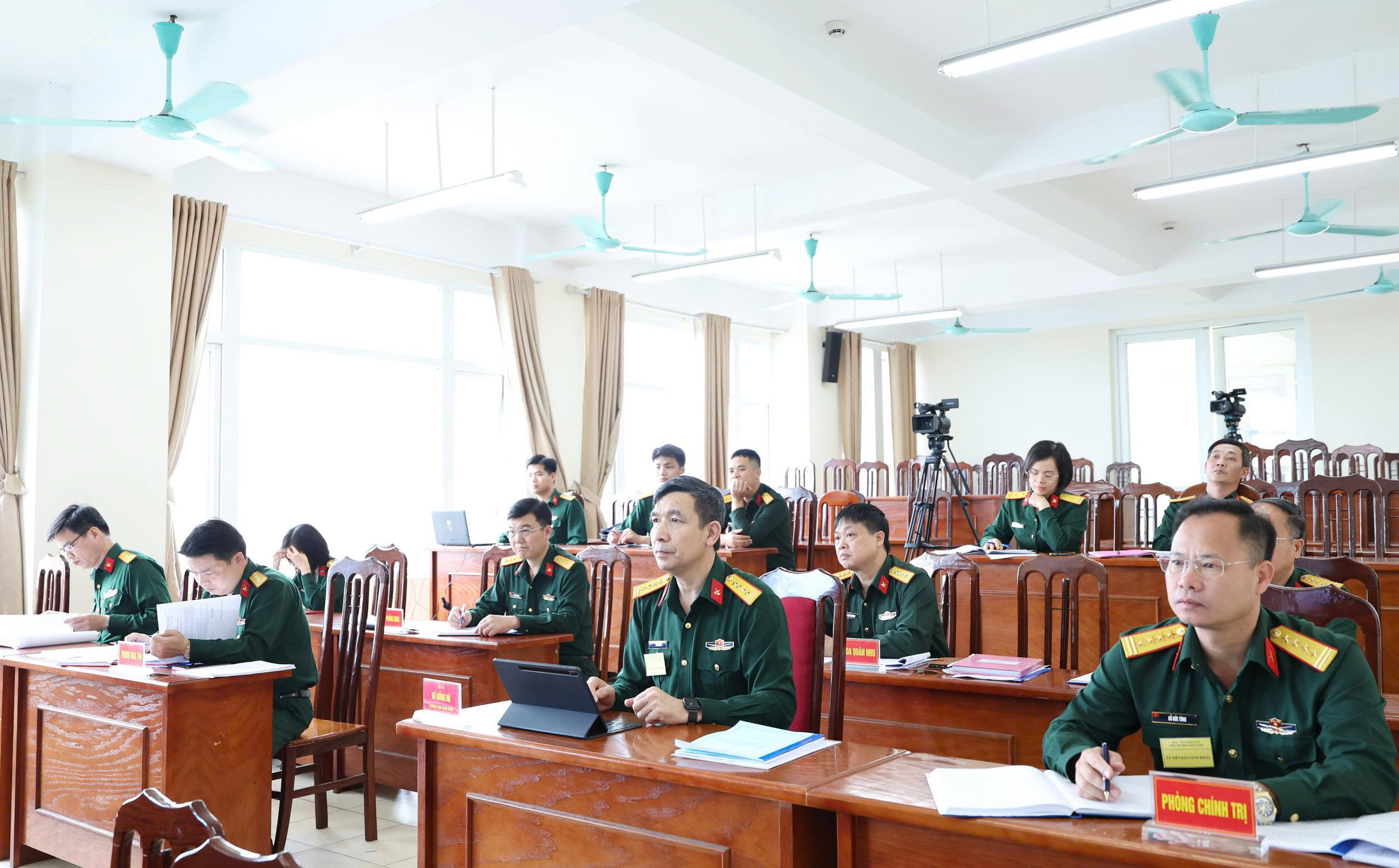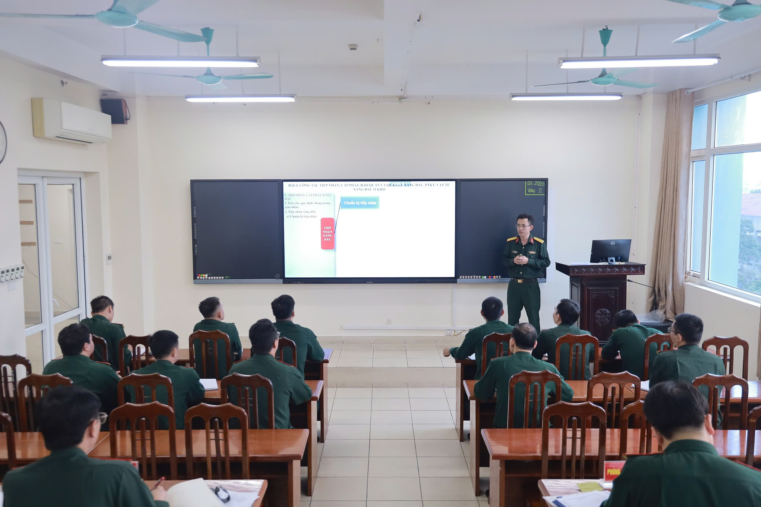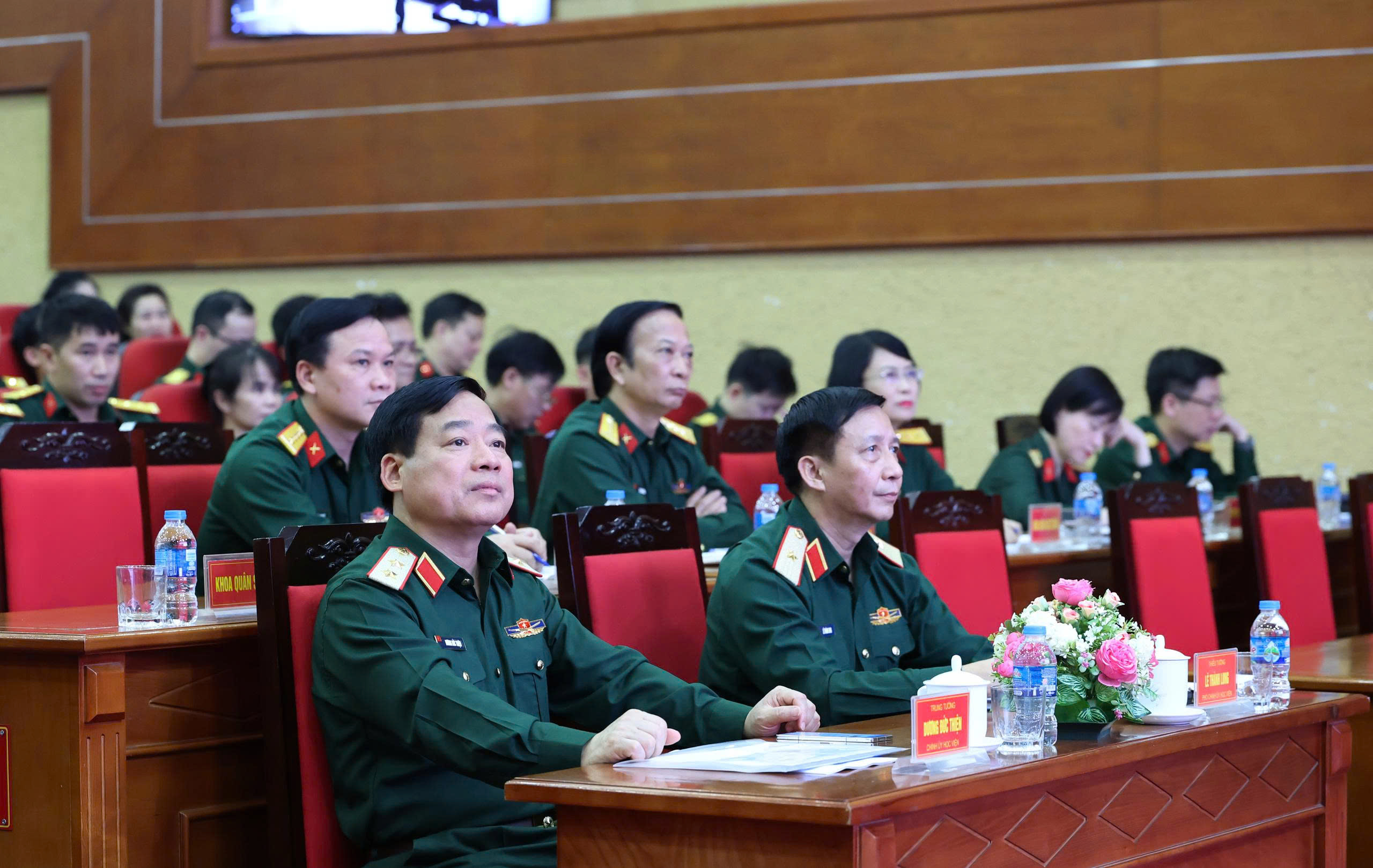 Lãnh đạo Học viện Hậu cần và các đại biểu theo dõi thí sinh thực hành thi giảng bài tại điểm cầu hội trường trung tâm.