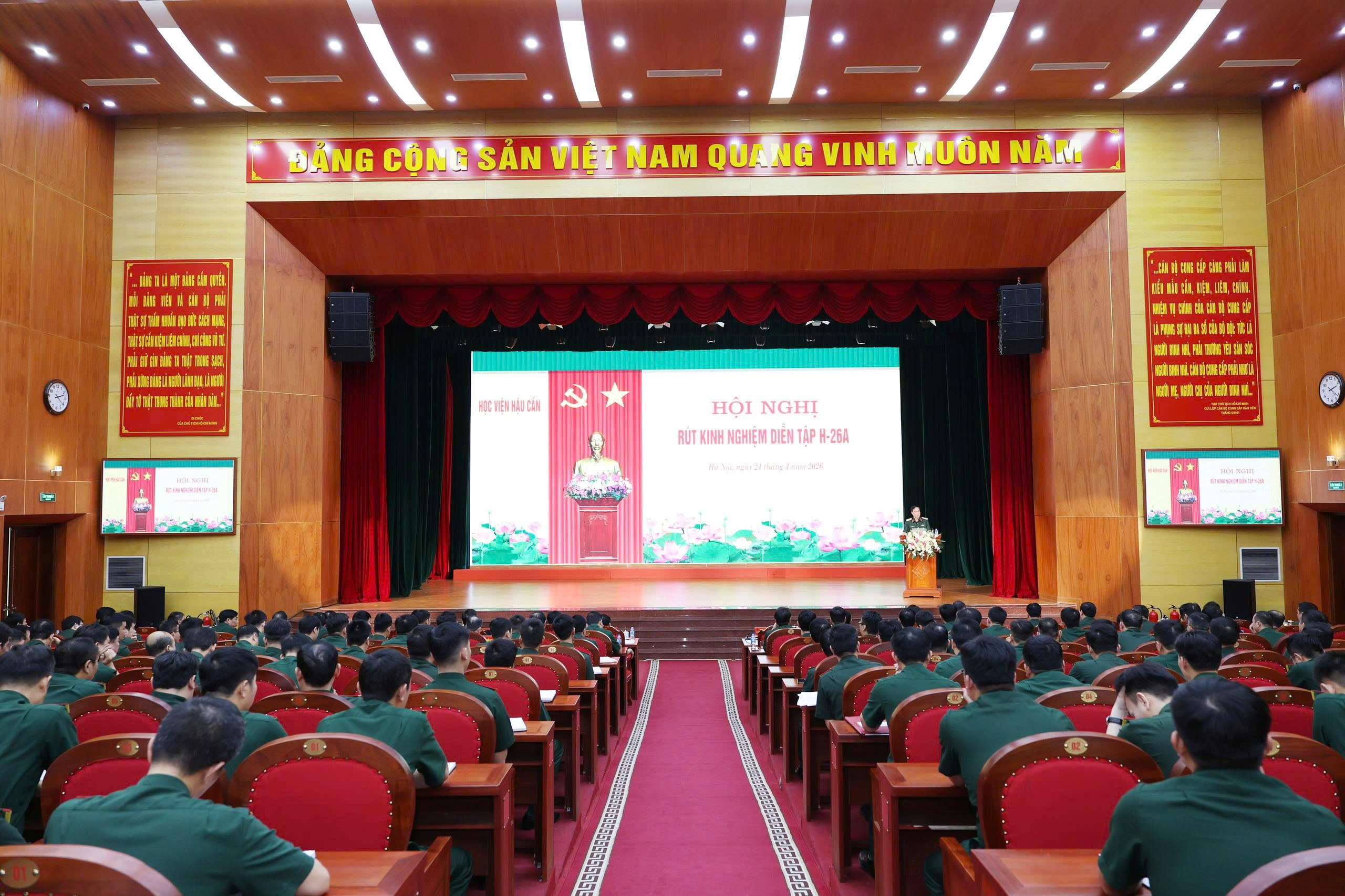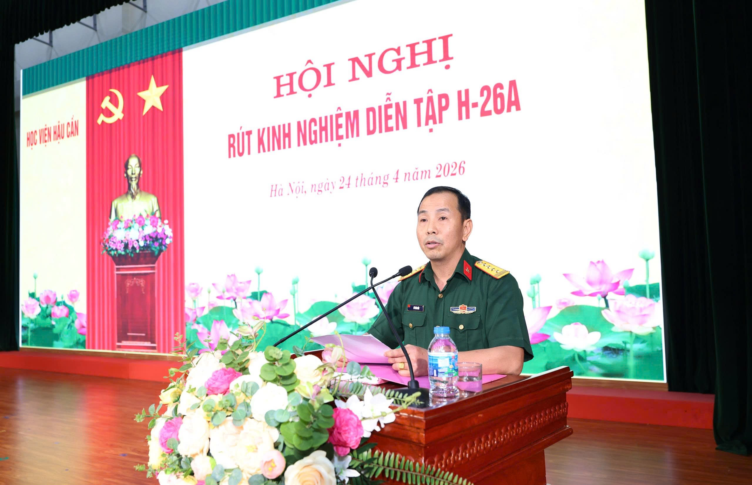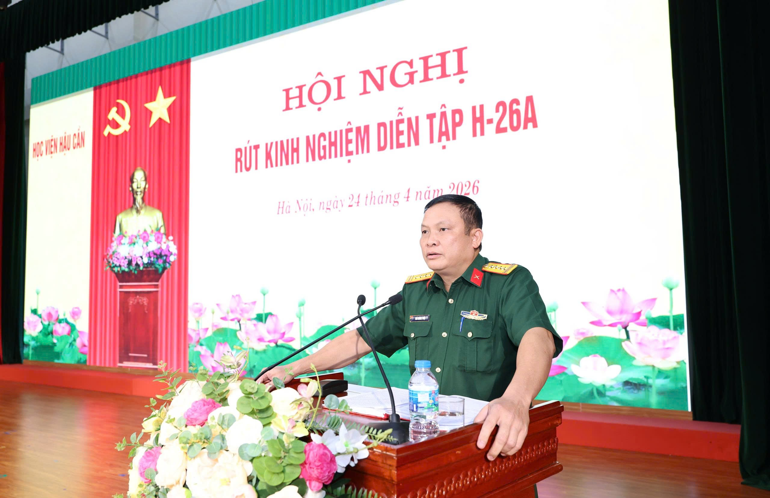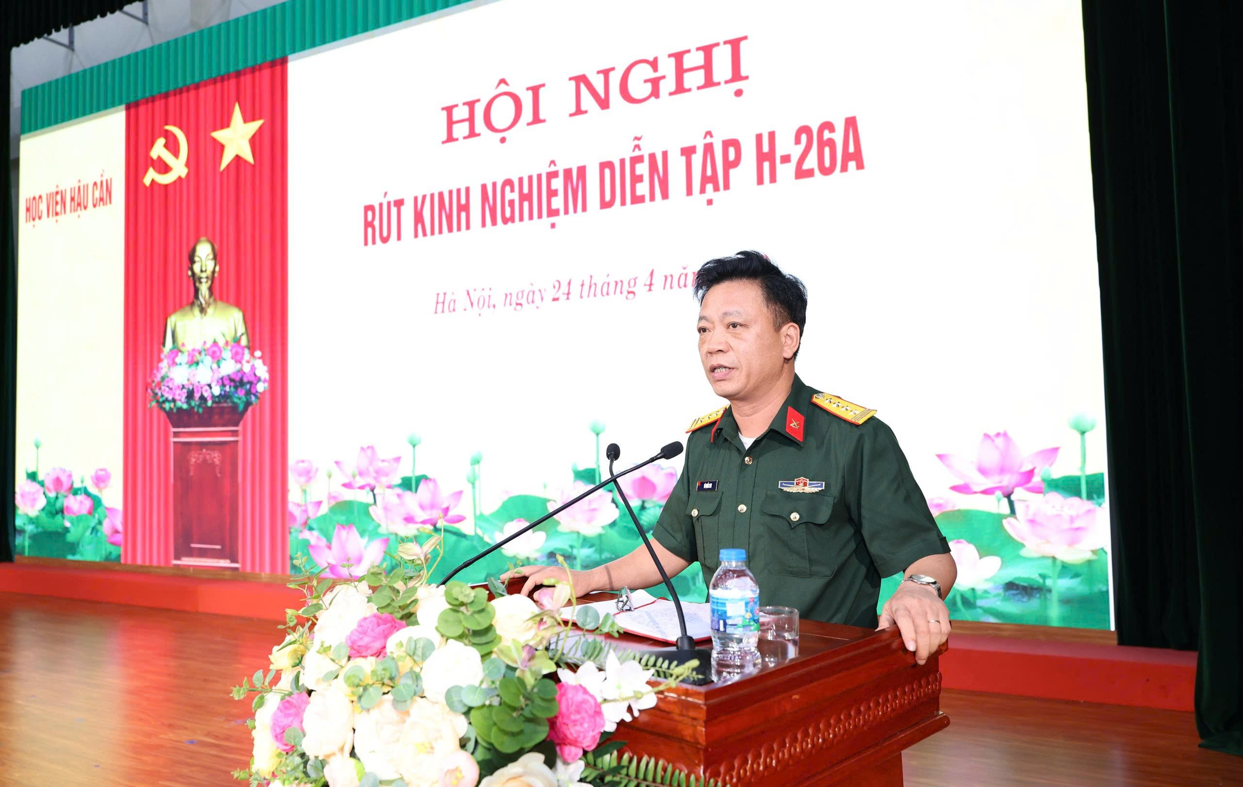 Chiều 24-4, Học viện Hậu cần tổ chức hội nghị rút kinh nghiệm diễn tập H-26A. Trung tướng, GS, TS Phan Tùng Sơn, Giám đốc Học viện Hậu cần chủ trì hội nghị.