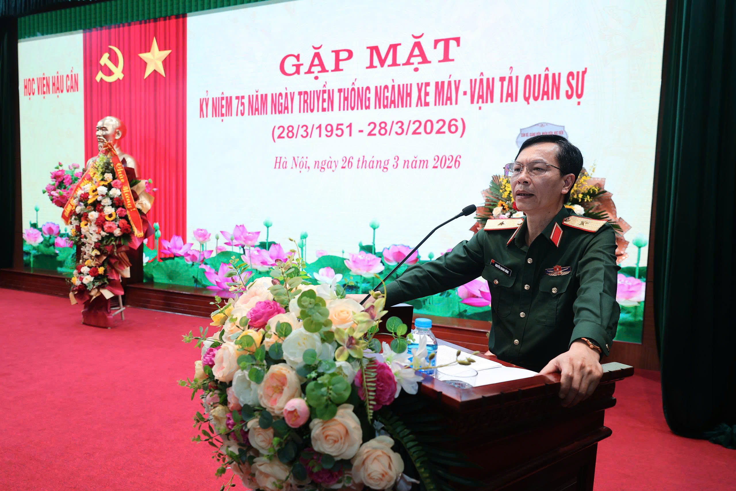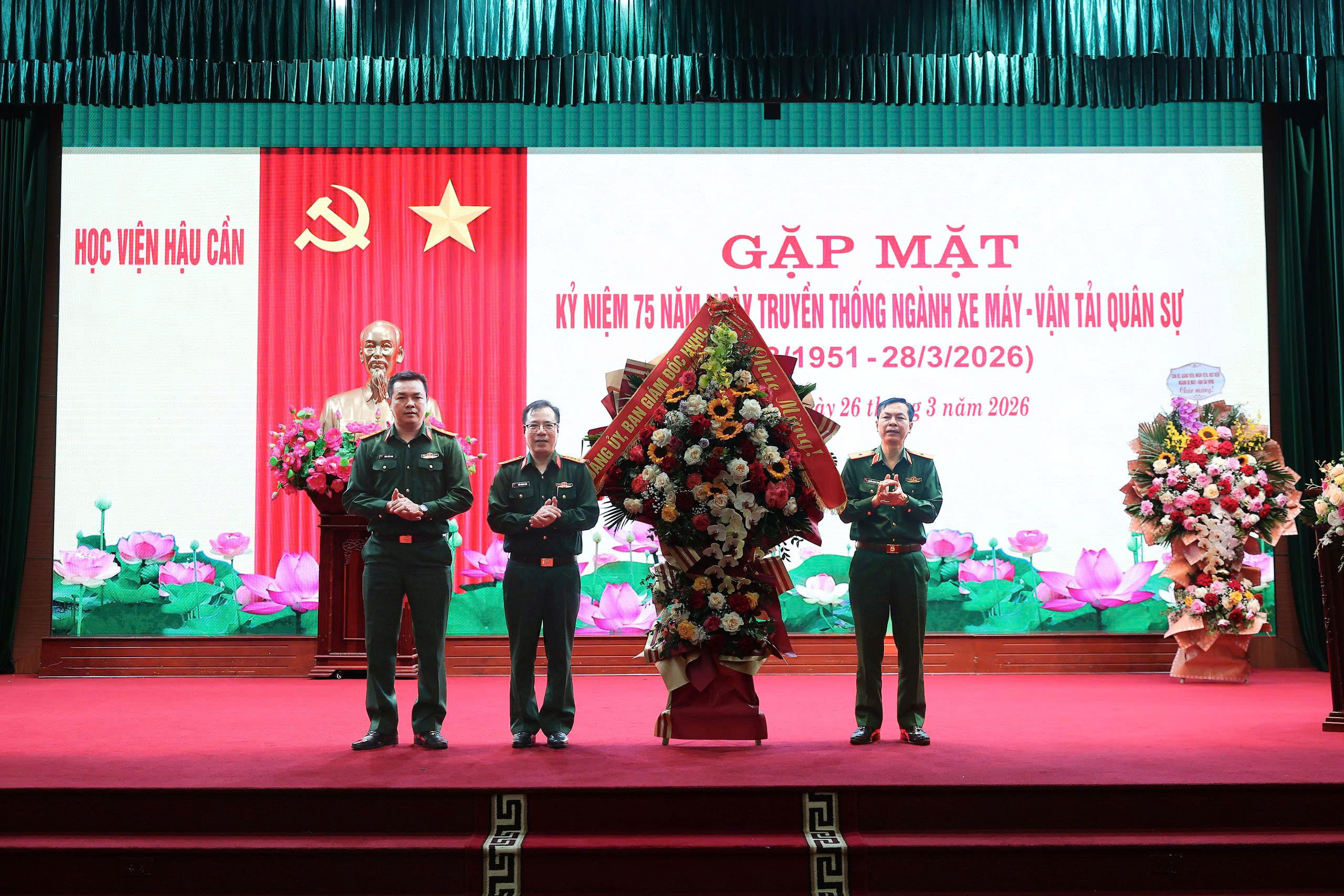 Chiều 26-3, tại Hà Nội, Học viện Hậu cần tổ chức gặp mặt kỷ niệm 75 năm Ngày truyền thống Ngành Xe máy - Vận tải quân sự (28/3/1951 - 28/3/2026). Dự buổi gặp mặt có Thiếu tướng, TS Nguyễn Quang Dũng, Phó Giám đốc Học viện; cùng dự có các đồng chí nguyên Chỉ huy Học viện; đại biểu chỉ huy Khoa Vận tải, Phòng Hậu cần - Kỹ thuật cùng đông đủ các thế hệ cán bộ, giảng viên, nhân viên, học viên ngành Xe máy - Vận tải.