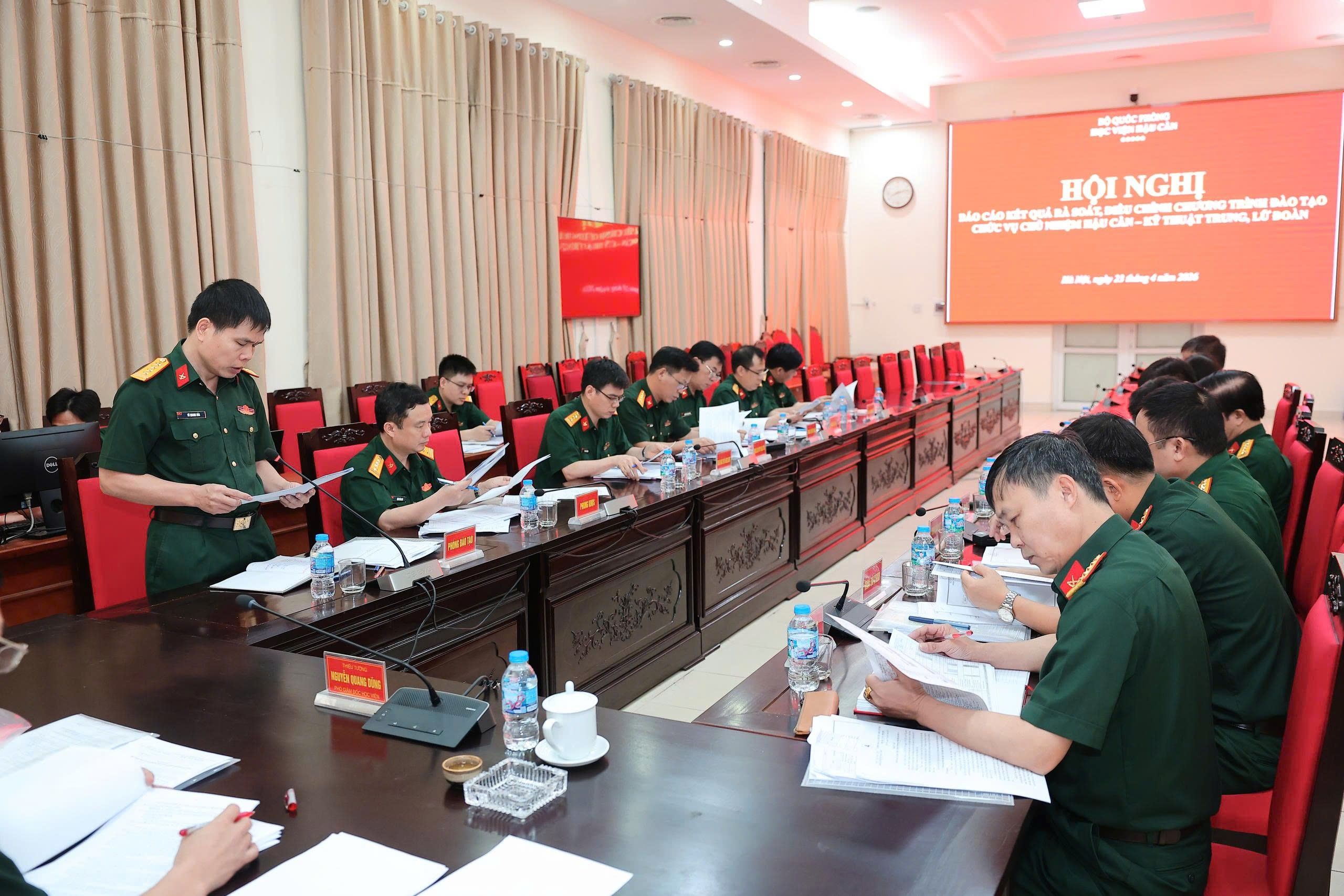 Sáng ngày 23-4, Học viện Hậu cần tổ chức Hội nghị thông qua kết quả rà soát, điều chỉnh, bổ sung chương trình đào tạo Chủ nhiệm hậu cần – kỹ thuật trung, lữ đoàn. Thiếu tướng, TS Nguyễn Quang Dũng, Phó Giám đốc Học viện, chủ trì hội nghị, tham dự có chỉ huy các cơ quan, khoa giáo viên trong Học viện.