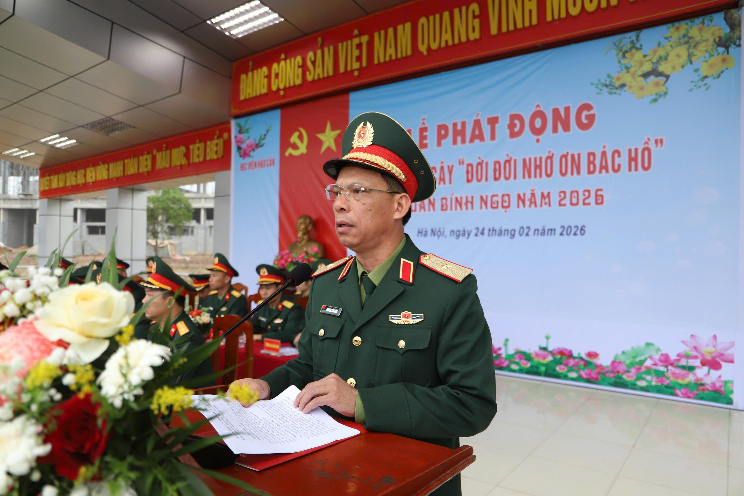 Thiếu tướng Nguyễn Văn Kiên, Phó Giám đốc Học viện Hậu cần phát biểu tại Lễ phát động Tết trồng cây “Đời đời nhớ ơn Bác Hồ” xuân Bính Ngọ 2026.