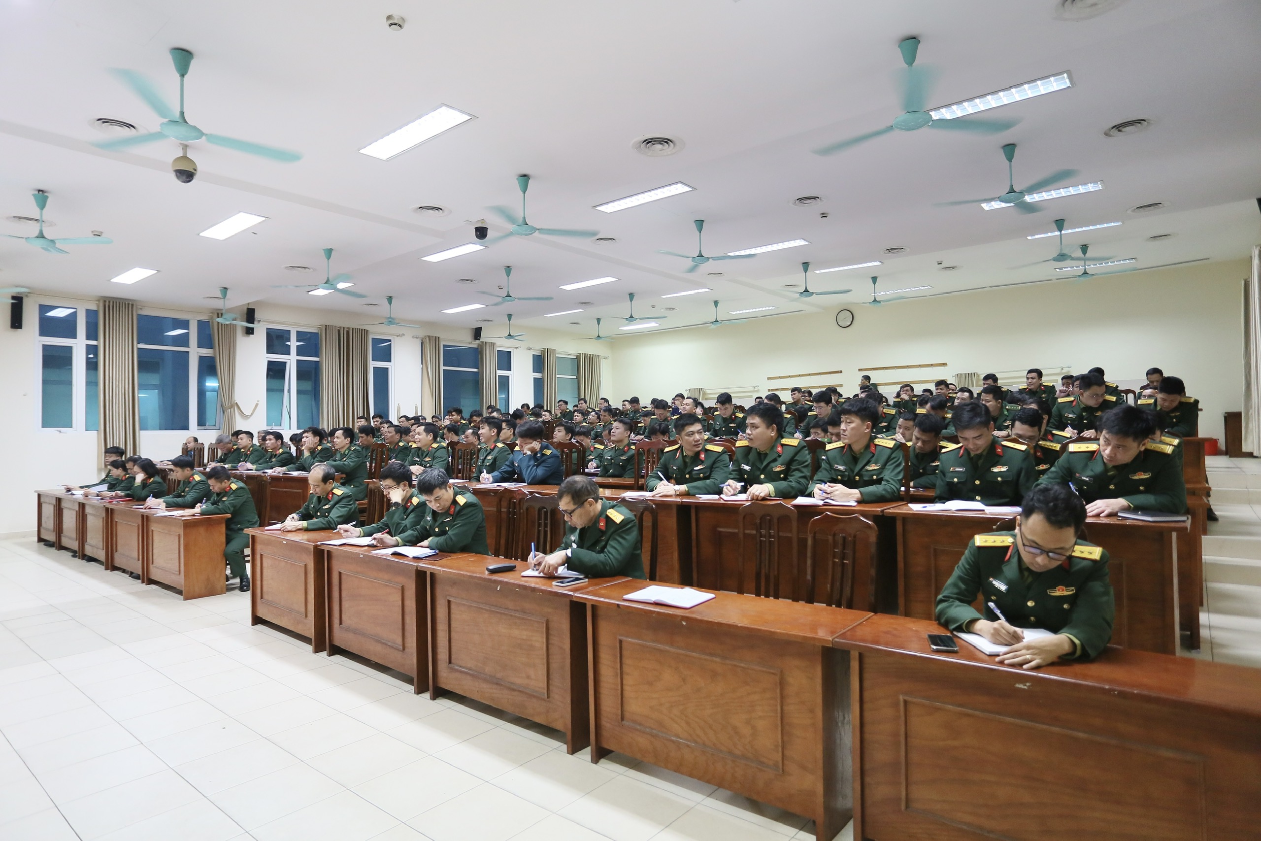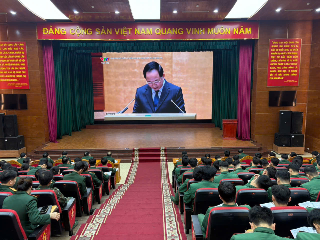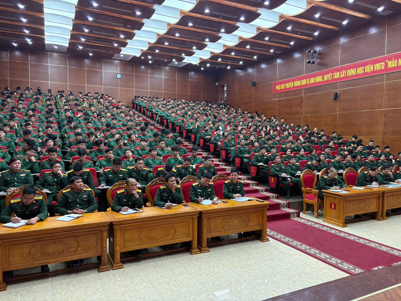 Tại điểm cầu Học viện Hậu cần, các đại biểu chăm chú theo dõi, ghi chép, nắm vững những nội dung cốt lõi, nhất là các nhiệm vụ xây dựng con người Việt Nam thời kỳ mới gắn với triển khai đồng bộ hệ giá trị văn hóa, hệ giá trị quốc gia, hệ giá trị gia đình; đồng thời quán triệt sâu sắc yêu cầu nâng cao hiệu quả quản lý, sử dụng nguồn lực, phát huy vai trò của kinh tế Nhà nước trong điều kiện mới.