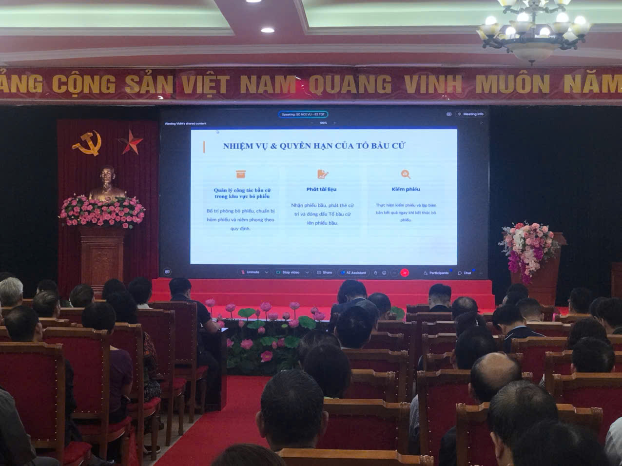 Tham dự tại điểm cầu có đại biểu cấp ủy, chính quyền địa phương; đại diện các cơ quan, đơn vị đứng chân trên địa bàn; cán bộ được phân công tham gia công tác bầu cử của Học viện Hậu cần. Hội nghị được tổ chức nghiêm túc, đúng thành phần, bảo đảm chất lượng nội dung và yêu cầu đề ra.