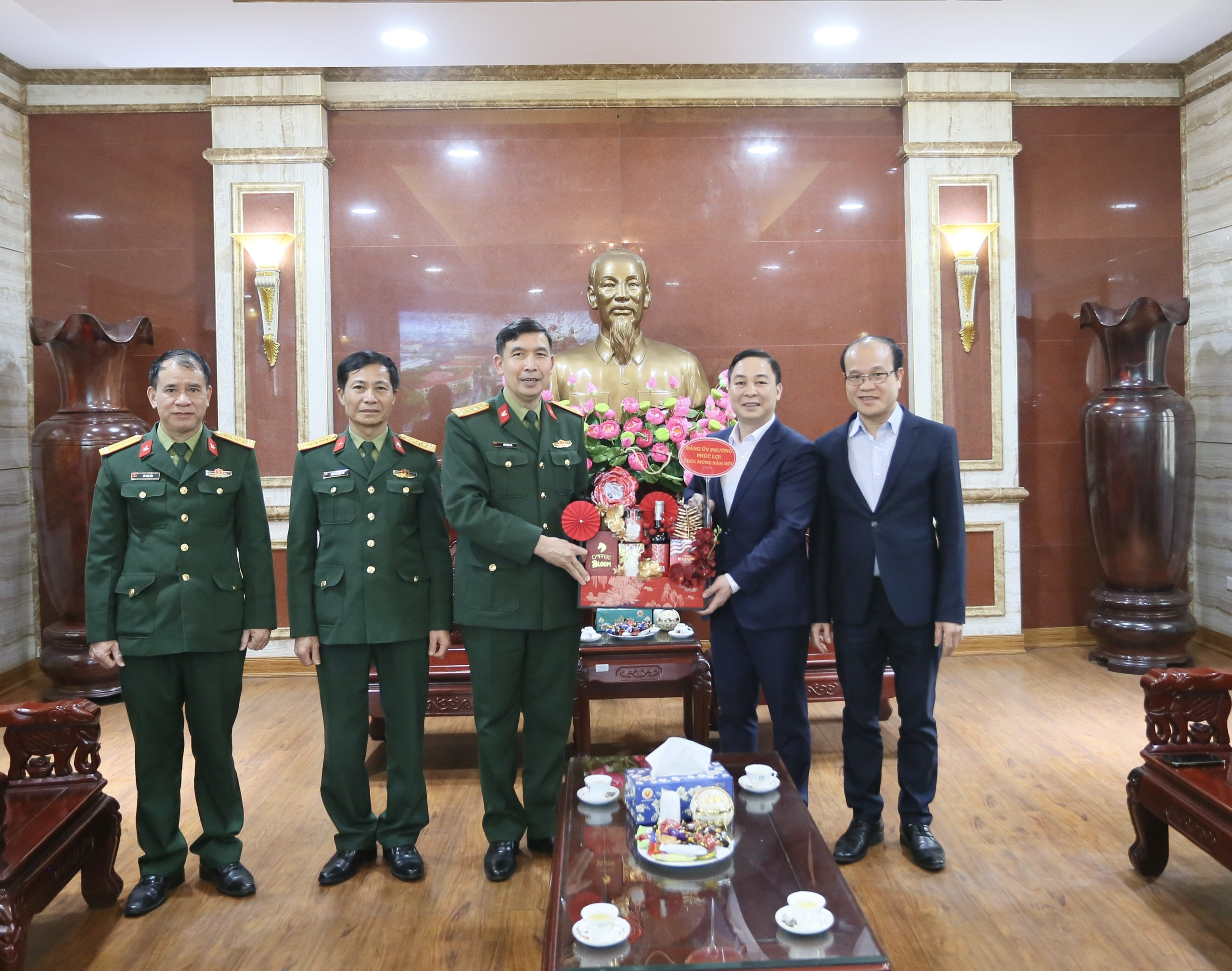 Trong dịp này, Đoàn đại biểu cấp ủy, chính quyền Phường Phúc Lợi (TP Hà Nội) cũng đã đến thăm, chúc Tết Học viện Hậu cần. Lãnh đạo địa phương ghi nhận và đánh giá cao sự phối hợp hiệu quả giữa Học viện với cấp ủy, chính quyền và nhân dân trên địa bàn trong thời gian qua, nhất là trong công tác dân vận, giữ gìn an ninh chính trị, trật tự an toàn xã hội, xây dựng địa bàn an toàn, vững mạnh. Nhân dịp năm mới, lãnh đạo phường gửi lời chúc mừng tốt đẹp tới cán bộ, giảng viên, học viên Học viện và mong muốn tiếp tục nhận được sự phối hợp, hỗ trợ của Học viện trong thời gian tới.