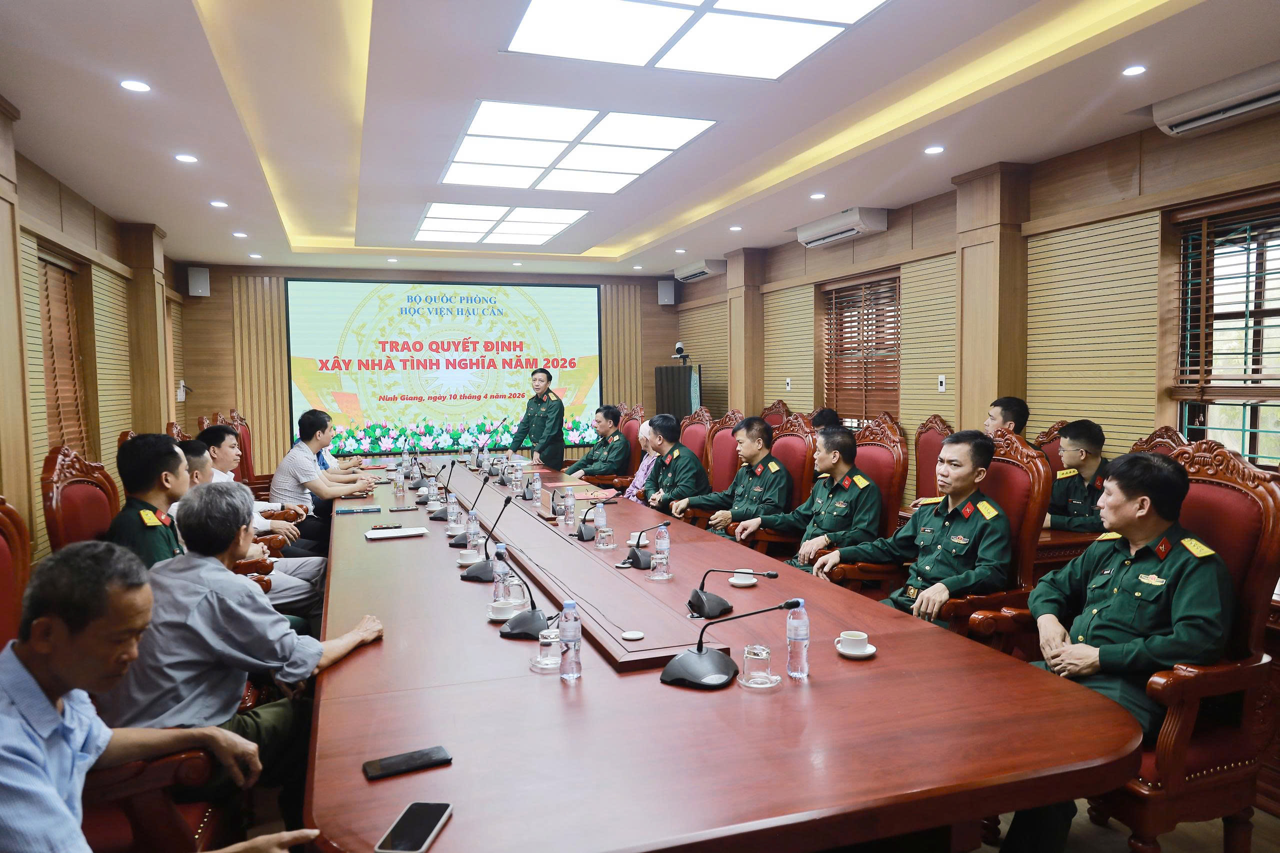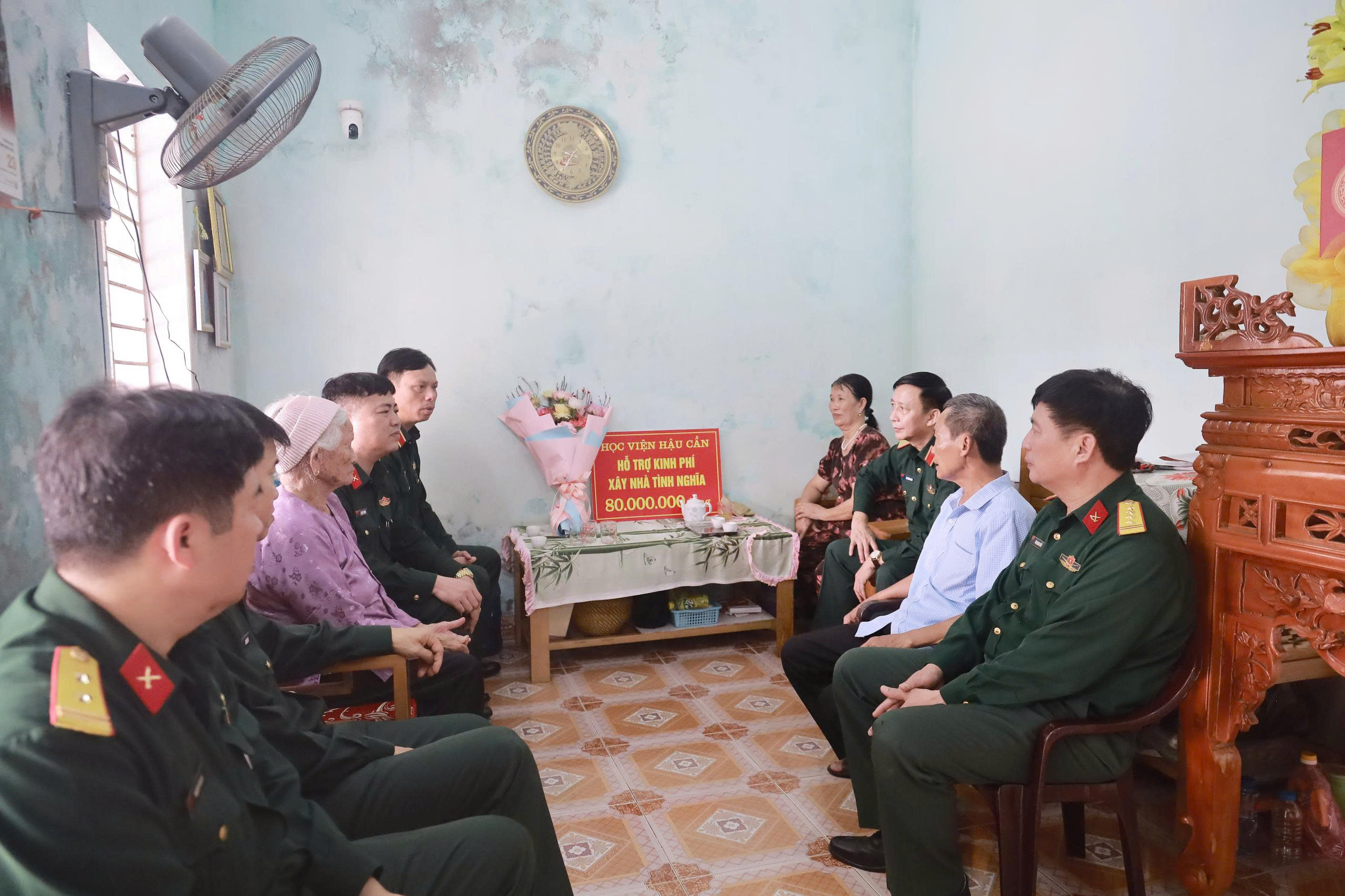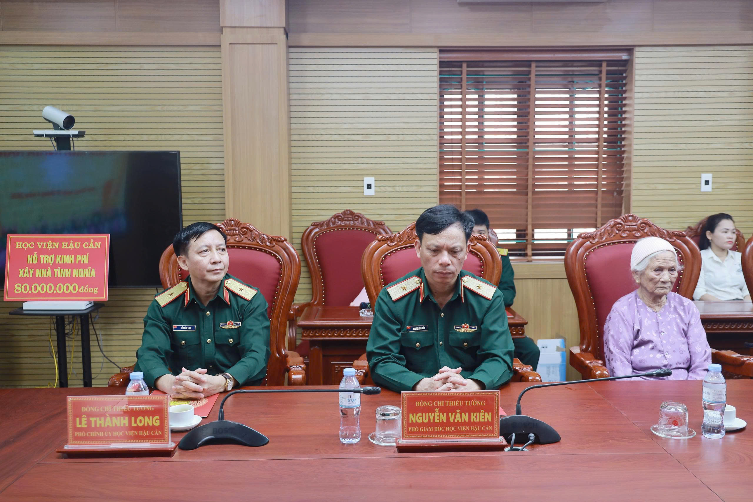 Tại hội nghị, Đại tá Lê Việt Cường, Chủ nhiệm Chính trị Học viện Hậu cần đã công bố quyết định hỗ trợ xây dựng Nhà tình nghĩa năm 2026 của Học viện đối với gia đình bà Phạm Thị Thái, với số tiền 80 triệu đồng, trích từ Quỹ “Đền ơn đáp nghĩa” của Học viện. Đây là nguồn kinh phí có ý nghĩa thiết thực, góp phần giúp gia đình có điều kiện xây dựng, sửa chữa nhà ở, ổn định cuộc sống lâu dài.