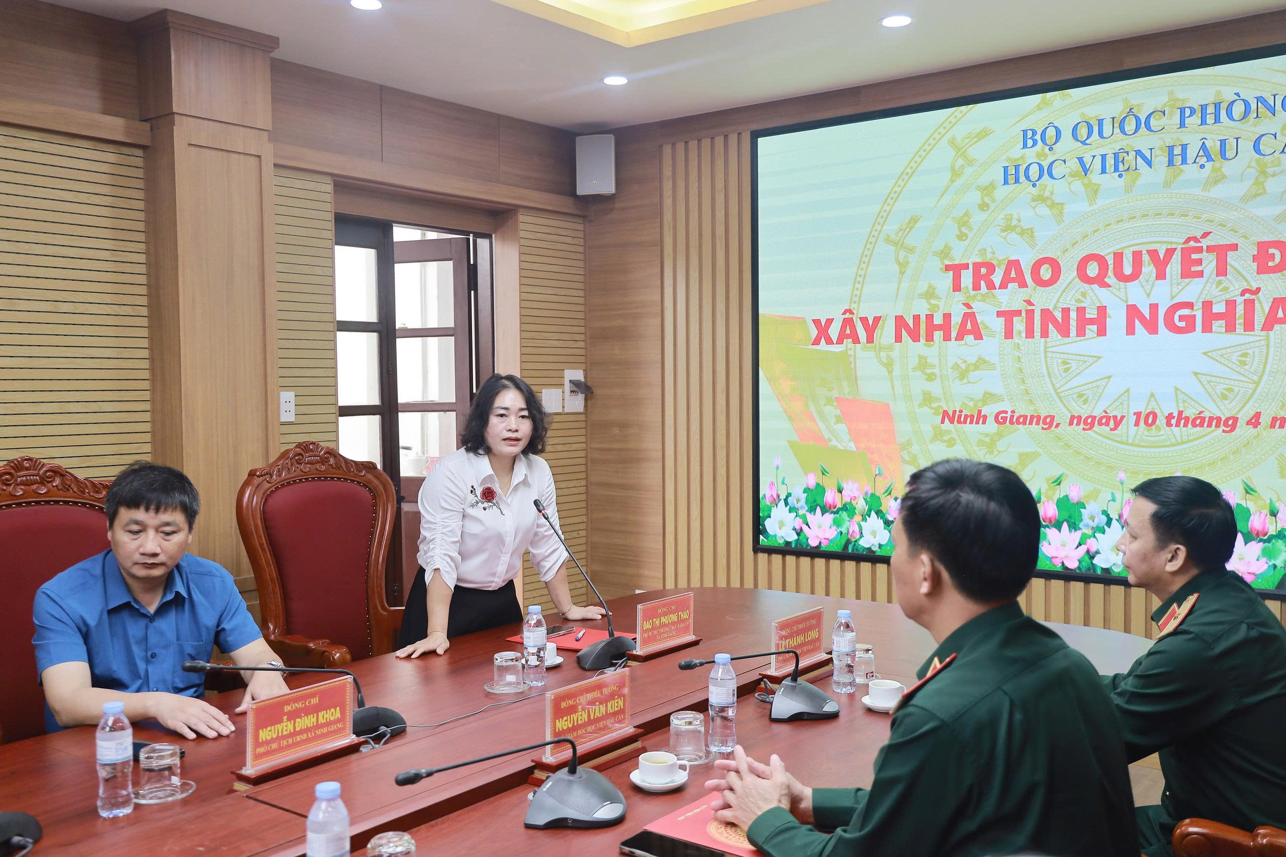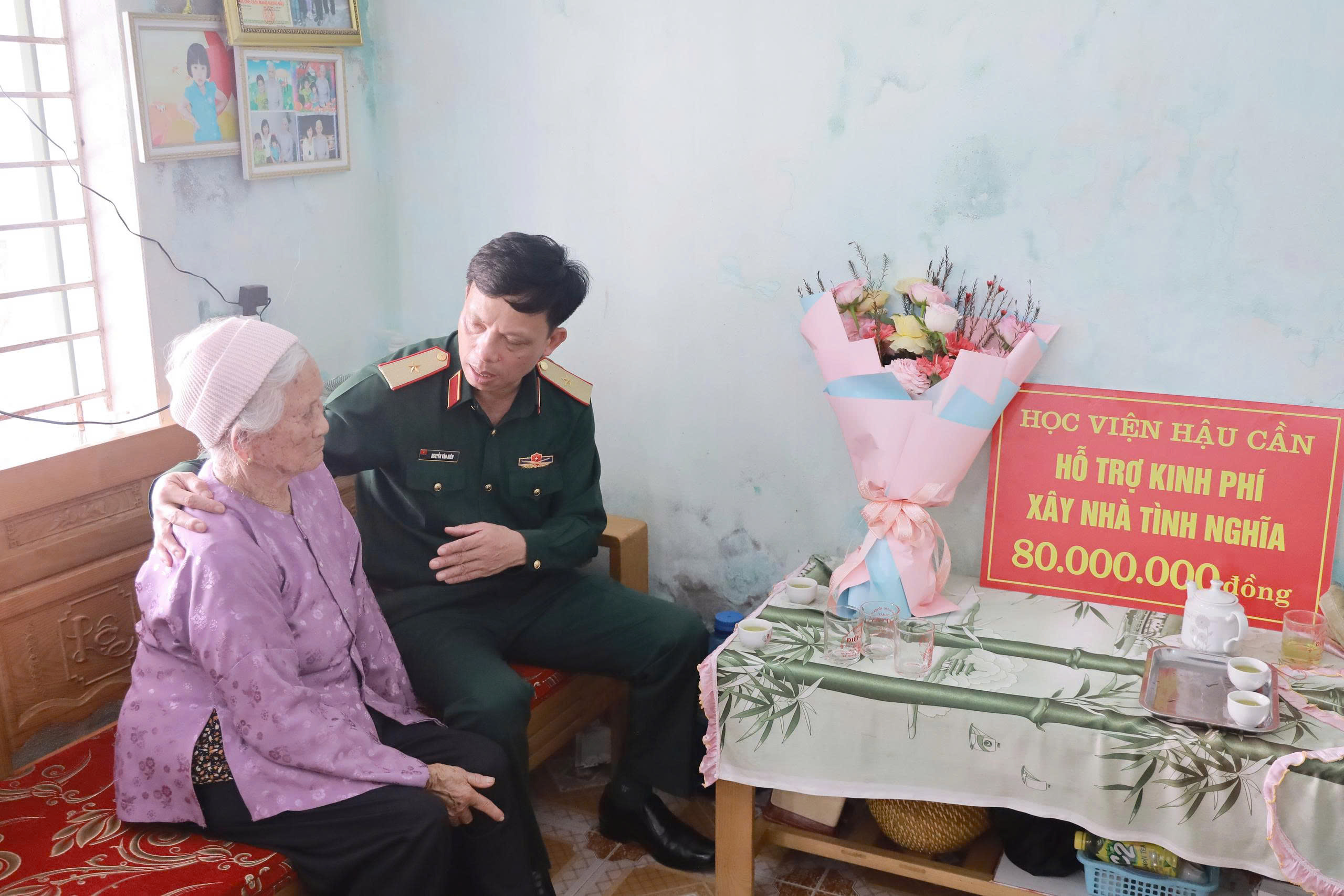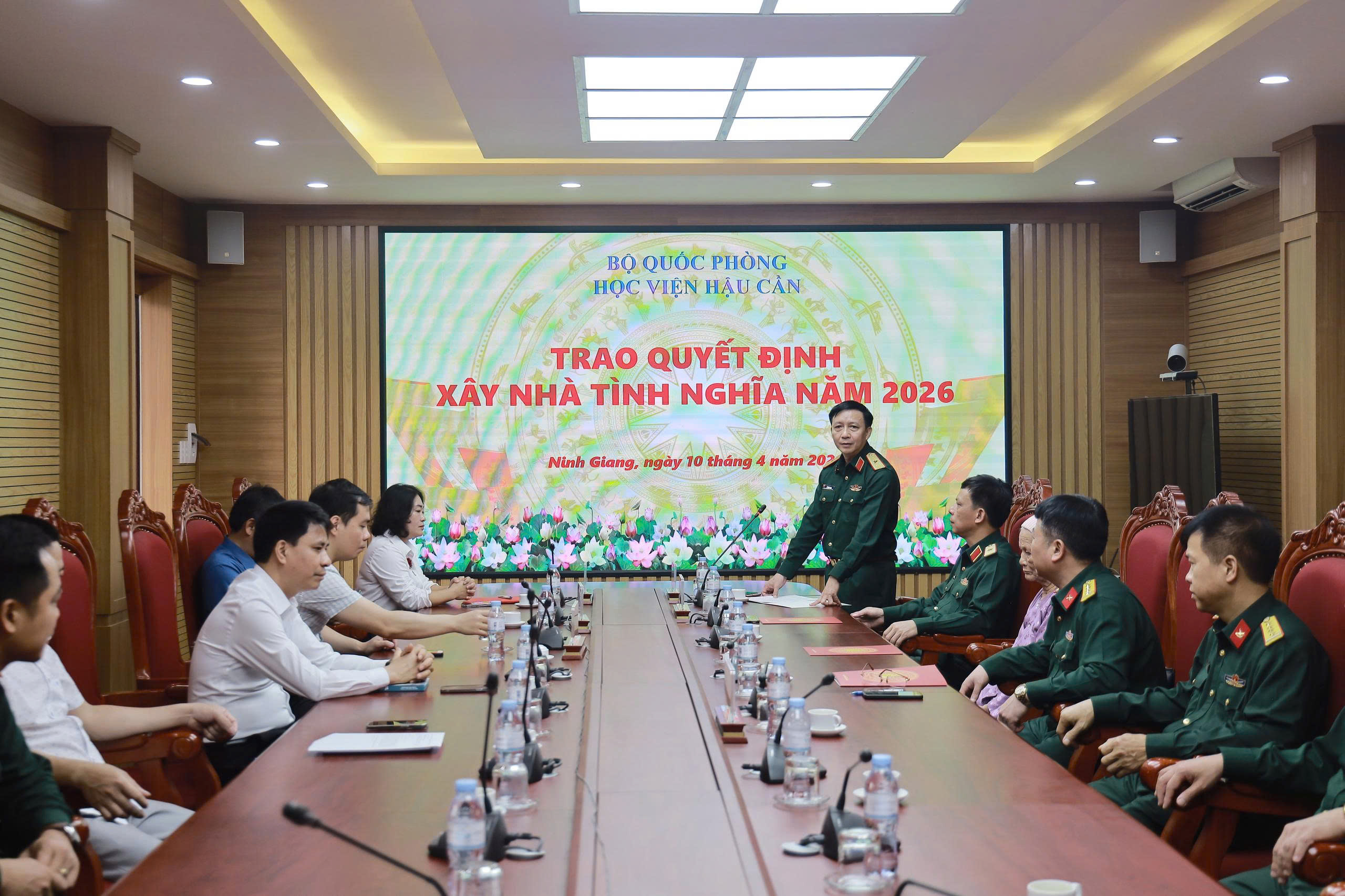 Tại hội nghị, Đại tá Lê Việt Cường, Chủ nhiệm Chính trị Học viện Hậu cần đã công bố quyết định hỗ trợ xây dựng Nhà tình nghĩa năm 2026 của Học viện đối với gia đình bà Phạm Thị Thái, với số tiền 80 triệu đồng, trích từ Quỹ “Đền ơn đáp nghĩa” của Học viện. Đây là nguồn kinh phí có ý nghĩa thiết thực, góp phần giúp gia đình có điều kiện xây dựng, sửa chữa nhà ở, ổn định cuộc sống lâu dài.