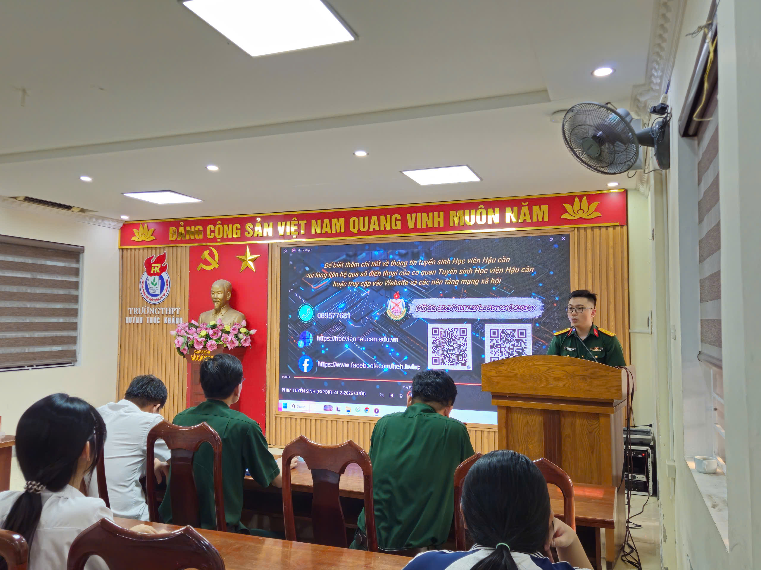 Tại các buổi tư vấn, Đoàn công tác đã giới thiệu khái quát hệ thống các học viện, nhà trường trong Quân đội; đồng thời cung cấp thông tin toàn diện về công tác tuyển sinh vào Học viện Hậu cần và các trường trong Quân đội năm 2026. Nội dung tập trung làm rõ quy trình sơ tuyển, điều kiện, tiêu chuẩn xét tuyển theo quy định; những điểm mới trong công tác tuyển sinh; cũng như các ngành, chuyên ngành đào tạo hiện nay của Học viện. Bên cạnh đó, học sinh được giới thiệu về môi trường học tập, rèn luyện trong Quân đội, môi trường kỷ luật, chính quy, thống nhất nhưng giàu tính nhân văn; các chế độ, chính sách đối với học viên; cùng cơ hội được đào tạo, phát triển toàn diện và trưởng thành trong môi trường quân ngũ, sẵn sàng nhận và hoàn thành tốt mọi nhiệm vụ được giao sau khi tốt nghiệp.