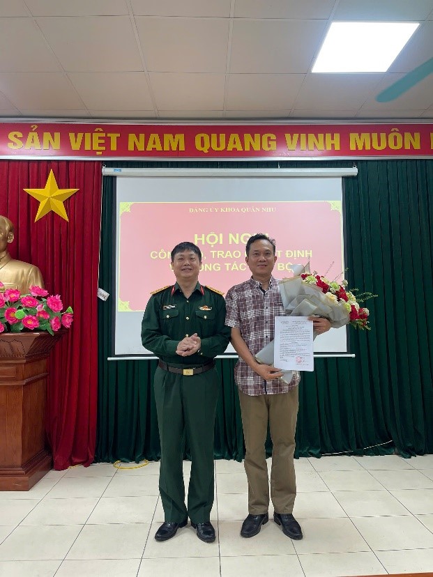 Theo quyết định của Bộ Quốc phòng, đồng chí Đại tá, PGS, TS Nguyễn Quang Quy nhận quyết định nghỉ hưu từ ngày 01/04/2026. Thay mặt Đảng ủy Khoa, đồng chí Đại tá, PGS, TS Nguyễn Thế Phương lên trao Quyết định và tặng hoa chúc mừng đồng chí Đại tá, PGS, TS Nguyễn Quang Quy. Phát biểu tại hội nghị, đồng chí Bí thư Đảng uỷ Khoa chúc mừng đồng chí Nguyễn Quang Quy đã hoàn thành xuất sắc nhiệm vụ mà Đảng, Nhà nước và Quân đội giao phó, đồng thời ghi nhận, đánh giá cao trình độ, năng lực chuyên môn và những đóng góp, cống hiến quan trọng đối với sự nghiệp giáo dục đào tạo của Học viện qua hơn 40 năm công tác. Trong suốt quá trình công tác, đồng chí luôn nhận được sự tín nhiệm từ cấp trên và đồng nghiệp, luôn được đánh giá là người cán bộ, đảng viên gương mẫu, giản dị, có tinh thần trách nhiệm cao, có nhiều đóng góp, xây dựng chi bộ Bộ môn Thương phẩm vững mạnh toàn diện, đóng góp vào những thành tựu chung của Khoa. Đồng chí Bí thư Đảng ủy Khoa cũng đã gửi lời chúc sức khỏe, hạnh phúc và mong muốn sau khi nghỉ hưu, đồng chí Nguyễn Quang Quy tiếp tục phát huy tinh thần gương mẫu của người đảng viên, tham gia đóng góp cho các hoạt động của cấp ủy, chính quyền địa phương nơi cư trú.