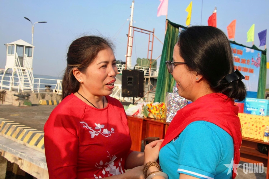 | Chị Trần Thị Thanh Nhàn, Giám đốc Công ty Khánh Nguyên Trần (Ninh Bình) tặng khăn quàng có hình cờ Tổ quốc cho một nữ phóng viên cùng lời chia sẻ trước khi tàu rời bến. |