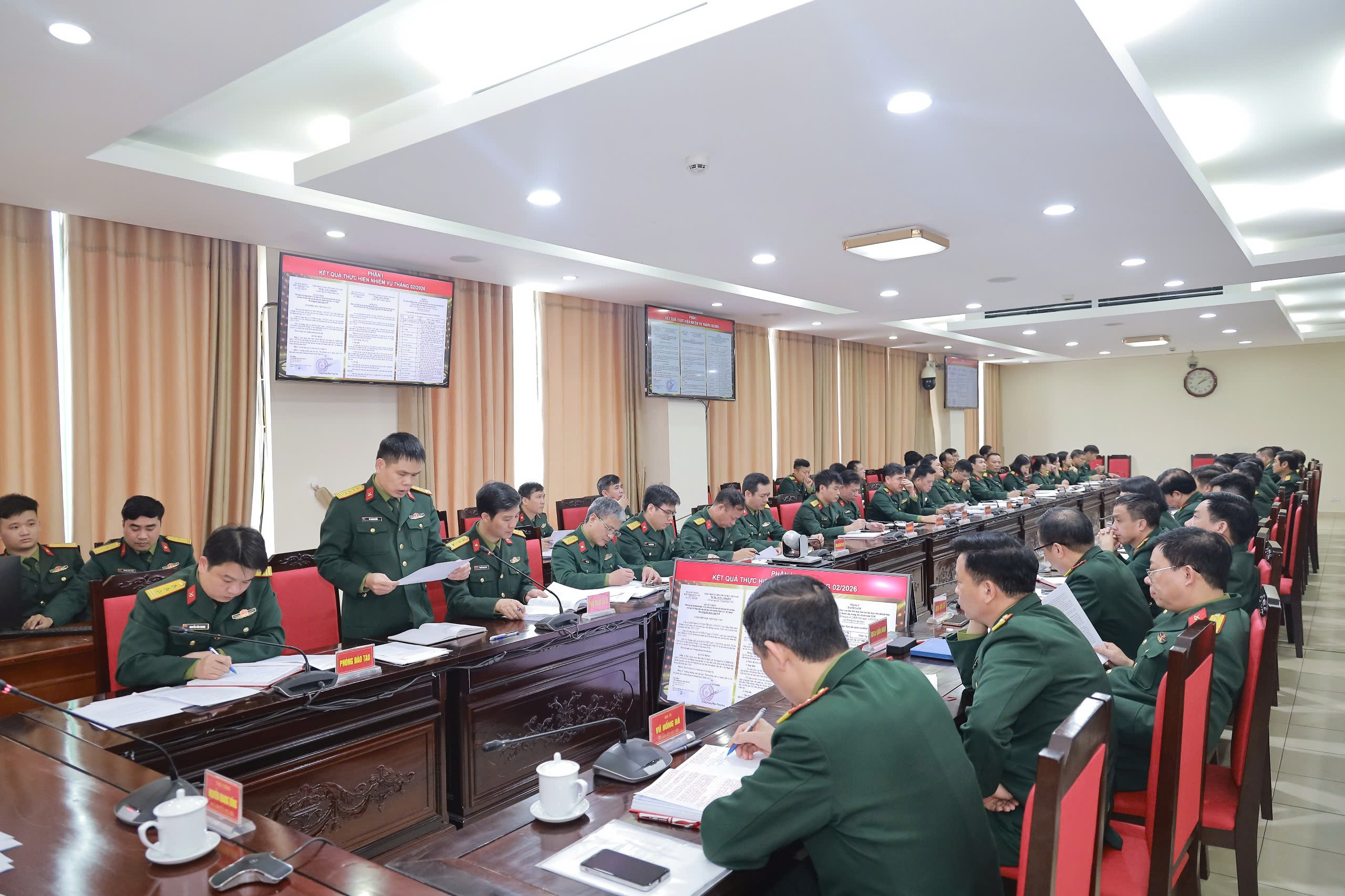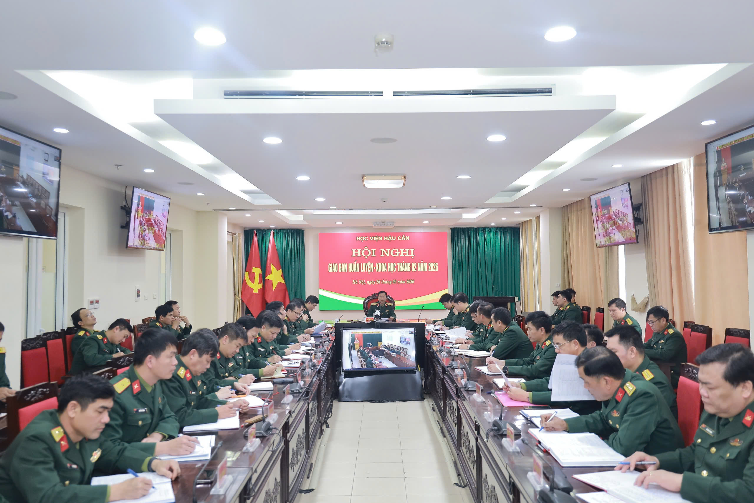 Chiều 26-02, tại khu vực 1, Học viện Hậu cần tổ chức Hội nghị giao ban đánh giá kết quả thực hiện nhiệm vụ huấn luyện - khoa học tháng 2; triển khai nhiệm vụ trọng tâm tháng 3 năm 2026. Hội nghị được tổ chức trực tiếp tại phòng họp H7A (khu vực 1) và trực tuyến tới điểm cầu S21 (khu vực 2).