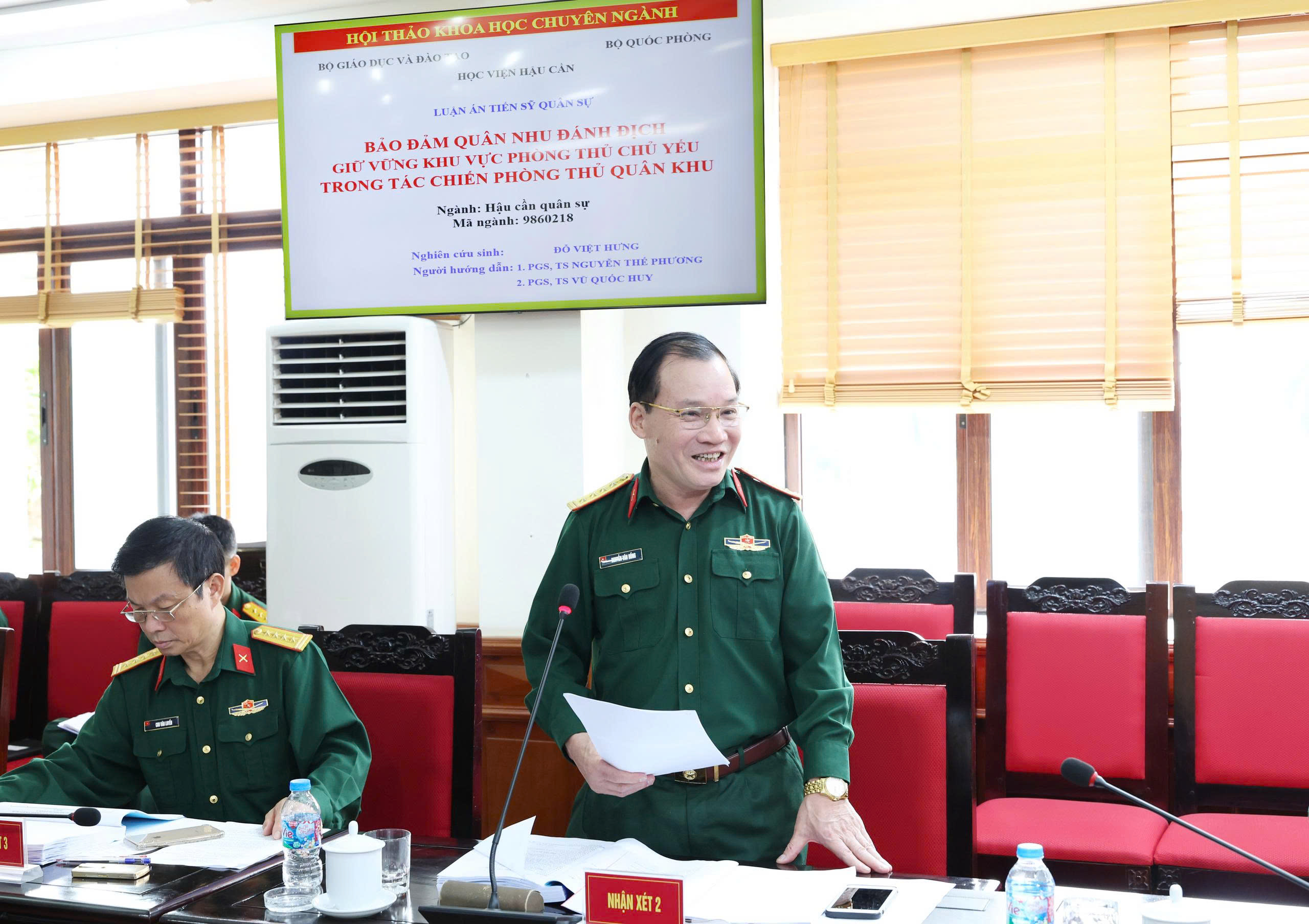 Đồng chí Giám đốc Học viện khẳng định, đề tài có tính mới, tính cấp thiết, bám sát yêu cầu thực tiễn xây dựng lực lượng và bảo đảm quân nhu trong tác chiến phòng thủ quân khu. Bố cục luận án hợp lý; nội dung nghiên cứu phù hợp với mục tiêu đề ra; các giải pháp được phân tích, luận giải tương đối chặt chẽ, có cơ sở khoa học và tính khả thi; không trùng lặp với các công trình đã công bố. Đồng thời yêu cầu nghiên cứu sinh nghiêm túc tiếp thu ý kiến của Hội đồng, khẩn trương chỉnh sửa, hoàn thiện luận án theo quy định.