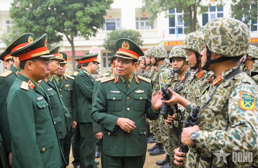 Đại tướng Nguyễn Tân Cương, Ủy viên Trung ương Đảng, Ủy viên Thường vụ Quân ủy Trung ương, Tổng Tham mưu trưởng, Thứ trưởng Bộ Quốc phòng kiểm tra vũ khí, trang bị của Lữ đoàn Đặc công Biệt động 1 (Binh chủng Đặc công).