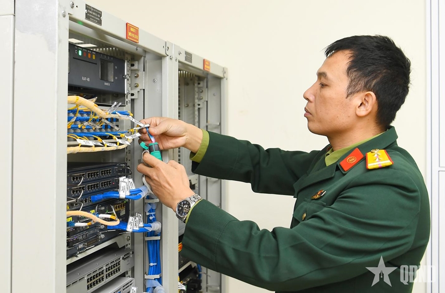 Nhân viên tổng đài Lữ đoàn 205 (Binh chủng Thông tin liên lạc) trực bảo đảm thông tin liên lạc, truyền hình phục vụ Đại hội XIV của Đảng.