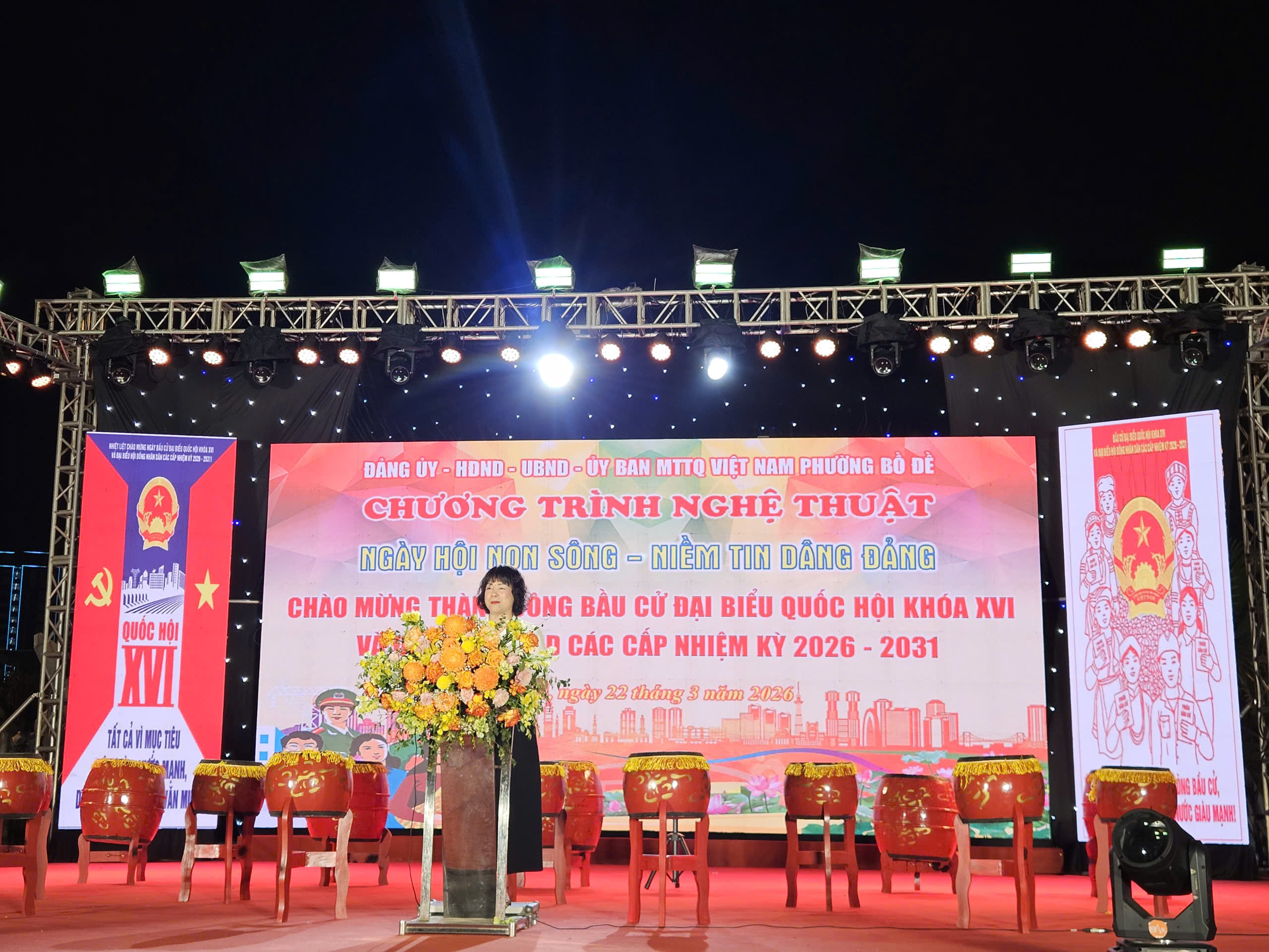 Tối 22-3, tại phường Bồ Đề, thành phố Hà Nội, đã diễn ra chương trình nghệ thuật với chủ đề “Ngày hội non sông - niềm tin dâng Đảng”, chào mừng thành công của cuộc bầu cử đại biểu Quốc hội khóa XVI và đại biểu Hội đồng nhân dân các cấp nhiệm kỳ 2026-2031. Chương trình thu hút sự tham dự của đông đảo cán bộ, đảng viên và nhân dân trên địa bàn.