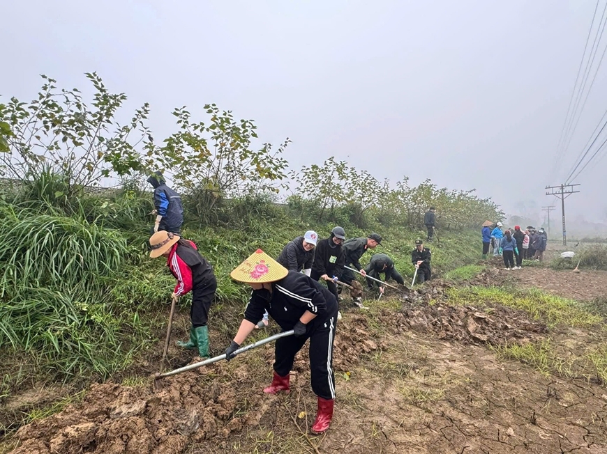 | Đông đảo bà con nhân dân phường Văn Phú, tỉnh Lào Cai tham gia lao động cùng bộ đội. |