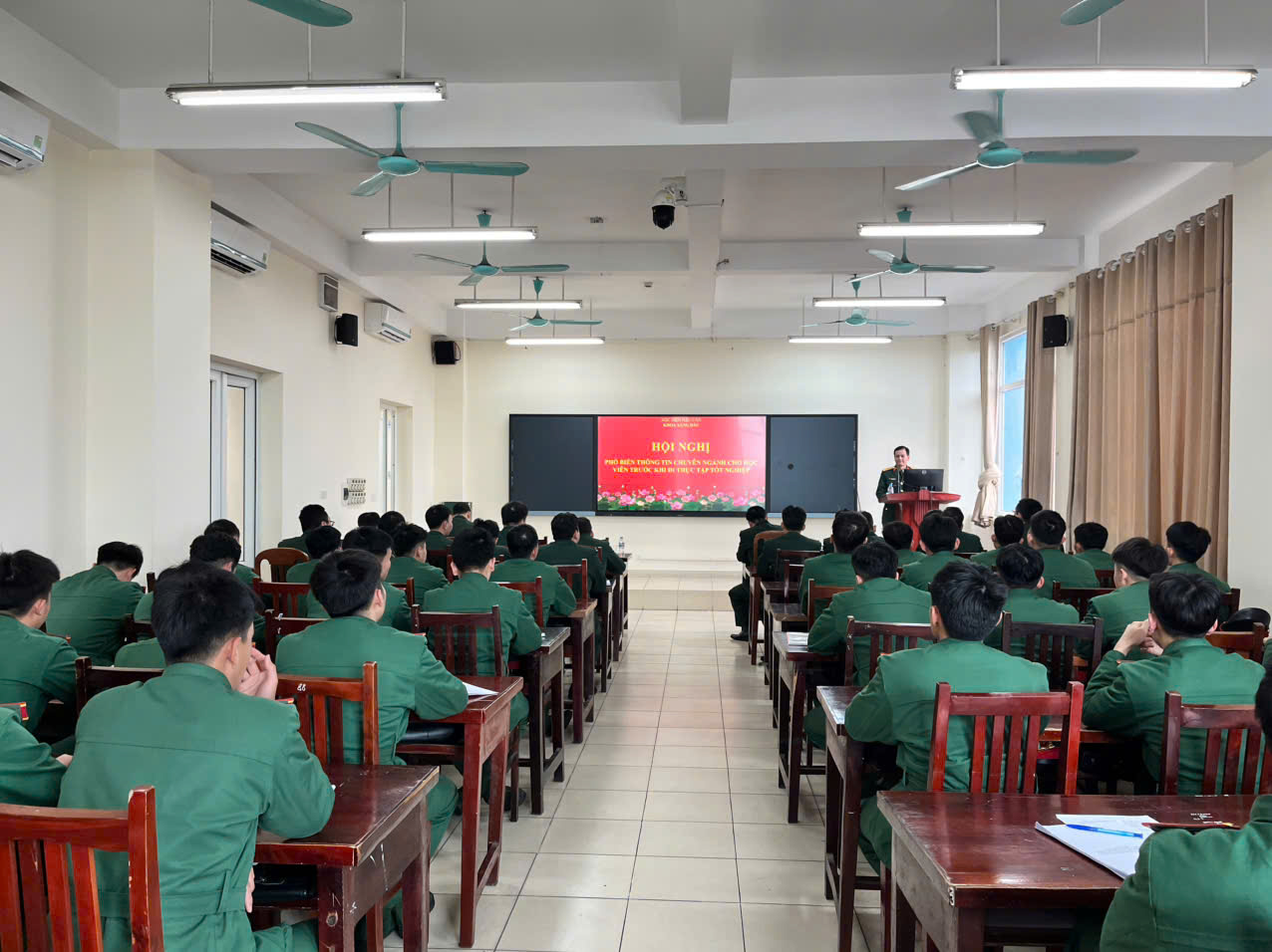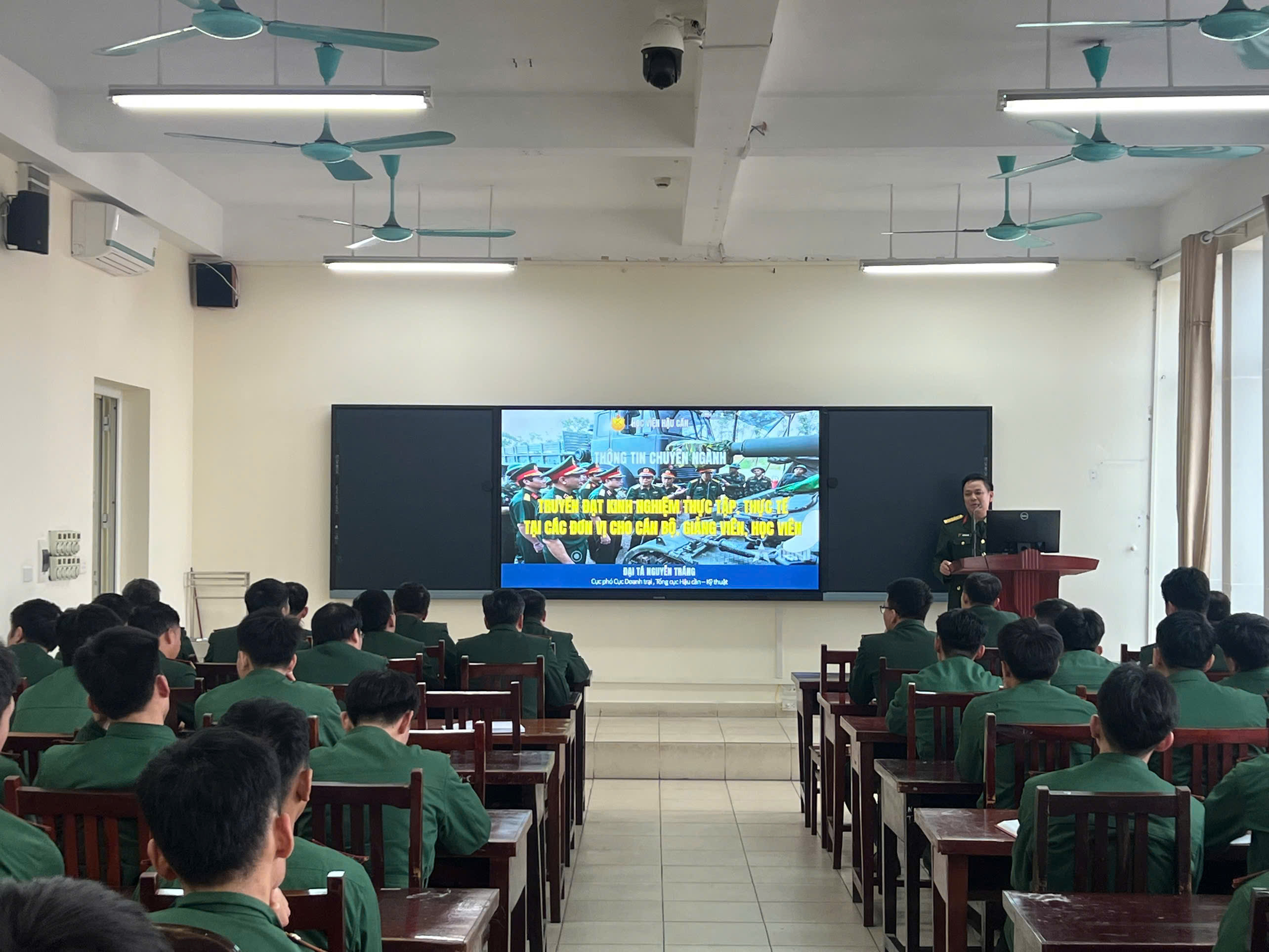 Đông đảo cán bộ, giảng viên và học viên Học viện Hậu cần dự buổi phổ biến thông tin chuyên ngành.