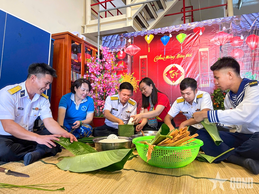 Với những vật liệu như đậu xanh, thịt lợn, lá dong… được đoàn công tác đưa ra từ đất liền, mọi người lại quây quần bên nhau, cùng gói những chiếc bánh chưng, cùng trang trí Tết, để giữa trùng khơi, cán bộ, chiến sĩ nhà giàn sẵn sàng đón một mùa xuân mới tràn đầy hơi ấm của đất liền, tràn đầy tình cảm quê nhà, tình đồng chí, đồng đội với nơi tiền phương sóng gió!