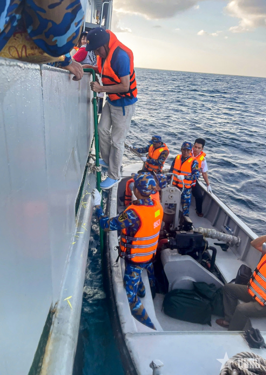 Bên cạnh mạn tàu, chiếc xuồng dềnh lên, tụt xuống theo từng con sóng. Vừa điều khiển xuồng bảo đảm ổn định một cách tương đối, tổ xuồng vừa hướng dẫn, giúp đỡ các thành viên xuống xuồng an toàn. Khoảng cách từ tàu tới nhà giàn không quá xa và nhân viên lái xuồng liên tục đánh lái để cắt sóng, đè sóng, nhưng vẫn không tránh khỏi có những con sóng chồm lên, hất nước vào xuồng, làm ướt quần áo.