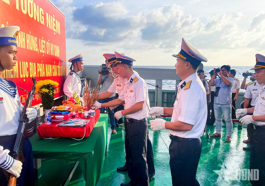 Từ sáng sớm, công tác tổ chức lễ tưởng niệm được đoàn công tác và cán bộ, chiến sĩ tàu Trường Sa 19 chuẩn bị chu đáo, trang trọng. Trên boong tàu, cán bộ, chiến sĩ và các đại biểu trong trang phục chỉnh tề, xếp hàng ngay ngắn trước vòng hoa hình lá cờ Tổ quốc, với dải băng mang dòng chữ “Đời đời nhớ ơn các Anh hùng liệt sĩ”.