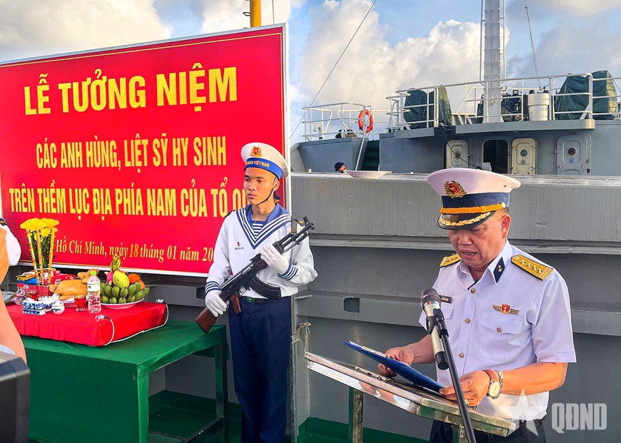 Trong không khí trang nghiêm, xúc động, Đại tá Lê Hồng Quang, Phó chủ nhiệm Chính trị Vùng 2 Hải quân, Trưởng đoàn công tác số 2 đã đọc diễn văn tưởng niệm, bày tỏ lòng thành kính và tiếc thương vô hạn đối với những Anh hùng, liệt sĩ, lòng kính trọng, đồng cảm và biết ơn sâu sắc tới thân nhân, gia đình các cán bộ, chiến sĩ đã anh dũng hy sinh trong khi thực hiện nhiệm vụ bảo vệ chủ quyền biển, đảo, thềm lục địa phía Nam của Tổ quốc.