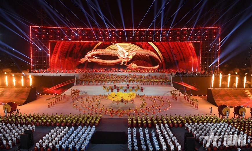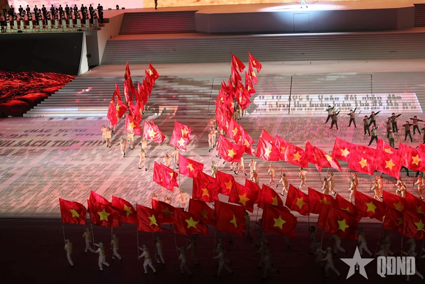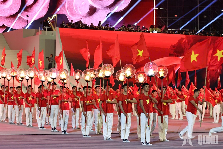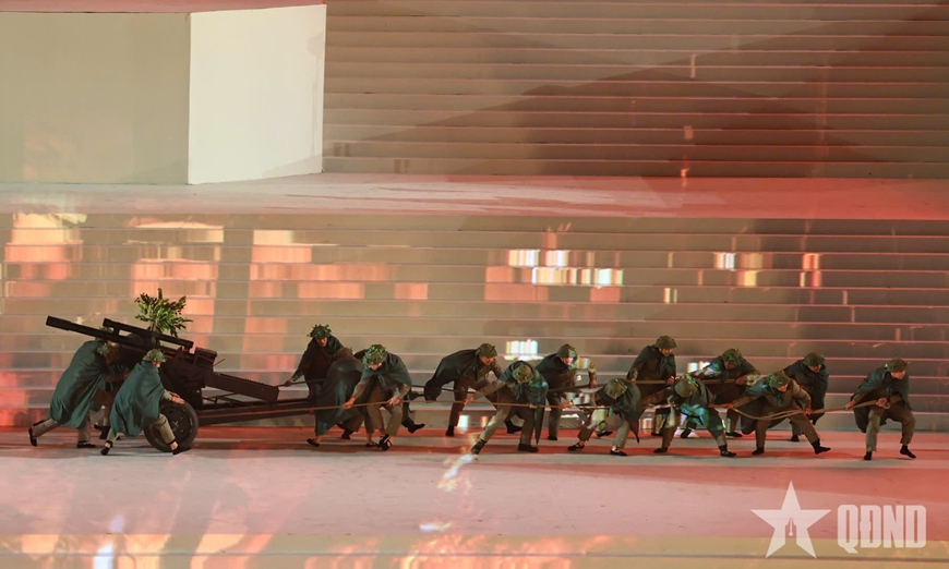 Cán bộ, học viên Học viện Hậu cần cùng các lực lượng tham gia biểu diễn trong chương trình nghệ thuật “Dưới lá cờ vẻ vang của Đảng” chào mừng Đại hội XIV của Đảng.
