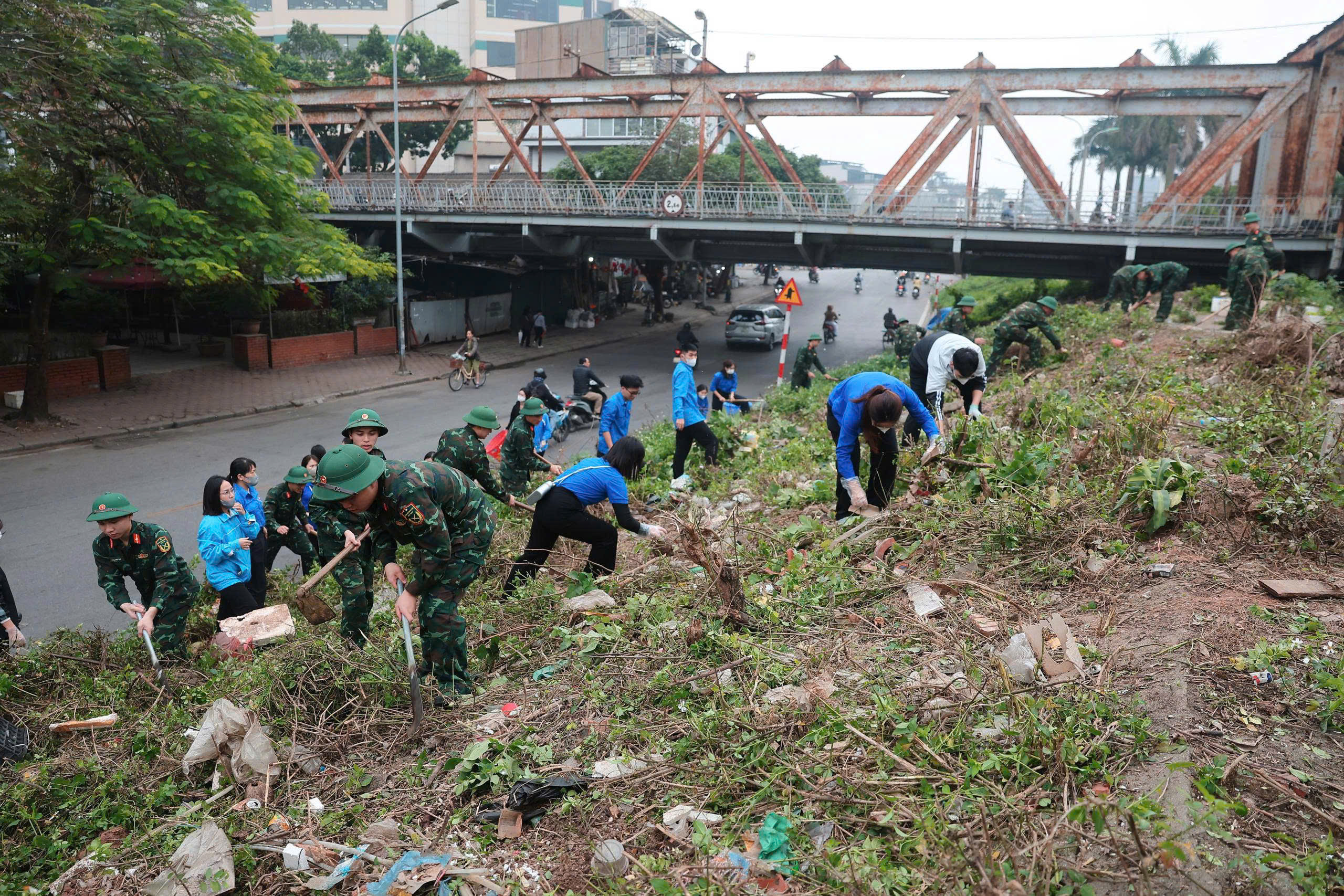 Cán bộ, đoàn viên, thanh niên Tiểu đoàn 3 và Đoàn phường Bồ Đề ra quân tổng dọn vệ sinh môi trường.